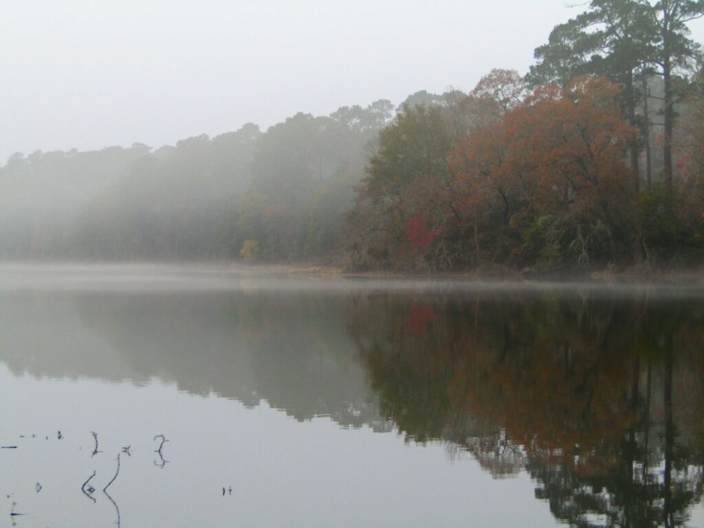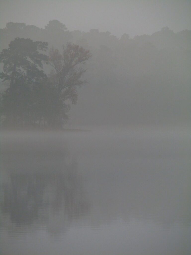 Thin ripples from fish jumping or the passage of water fowl, but other than that, no breeze stirring at all. I have always loved thick fog. Something about the possibility of what might be concealed within, both peaceful and potentially thrilling. Maybe it taps into the classic art of building suspense, which the modern horror film genre has all but abandoned.