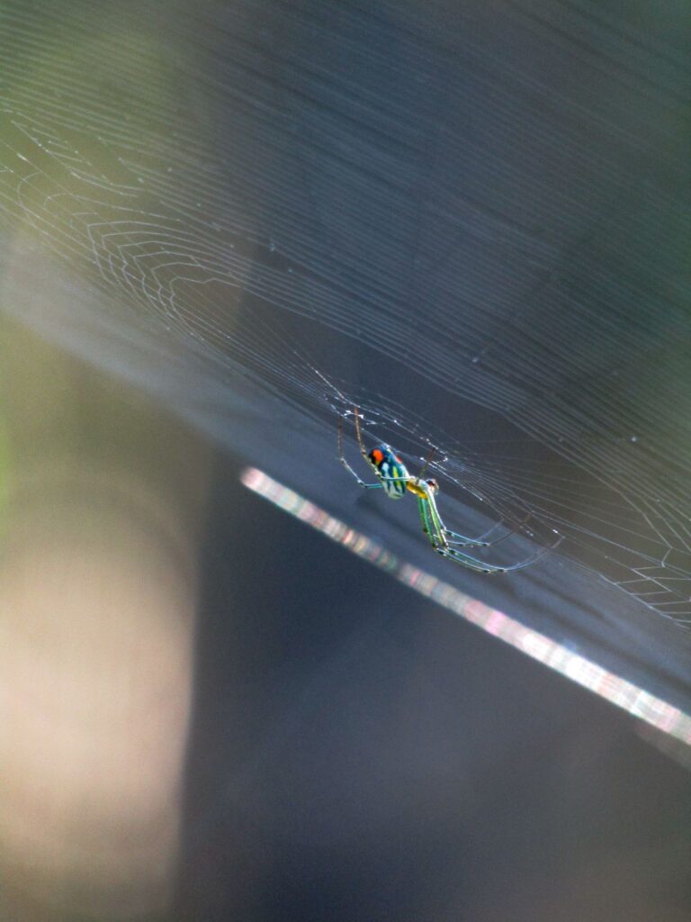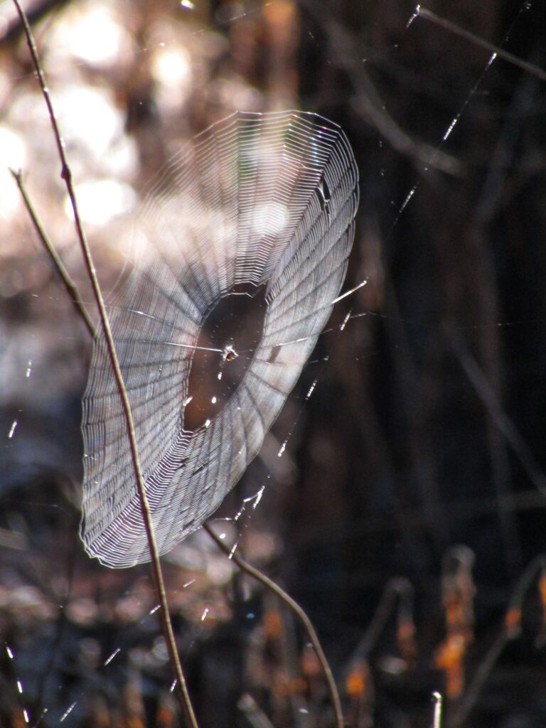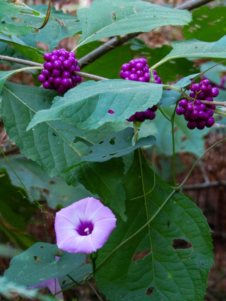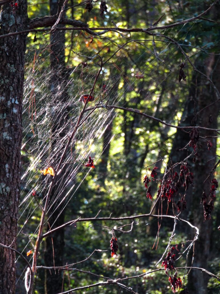 The American Beautyberries seemed to have gotten a bit farther along, since the last walk in these woods, and were joined by this little flowering vine. Farther down, the trail, the relatively low angle of the morning sun was playing off the spiderwebs quite nicely, as well.