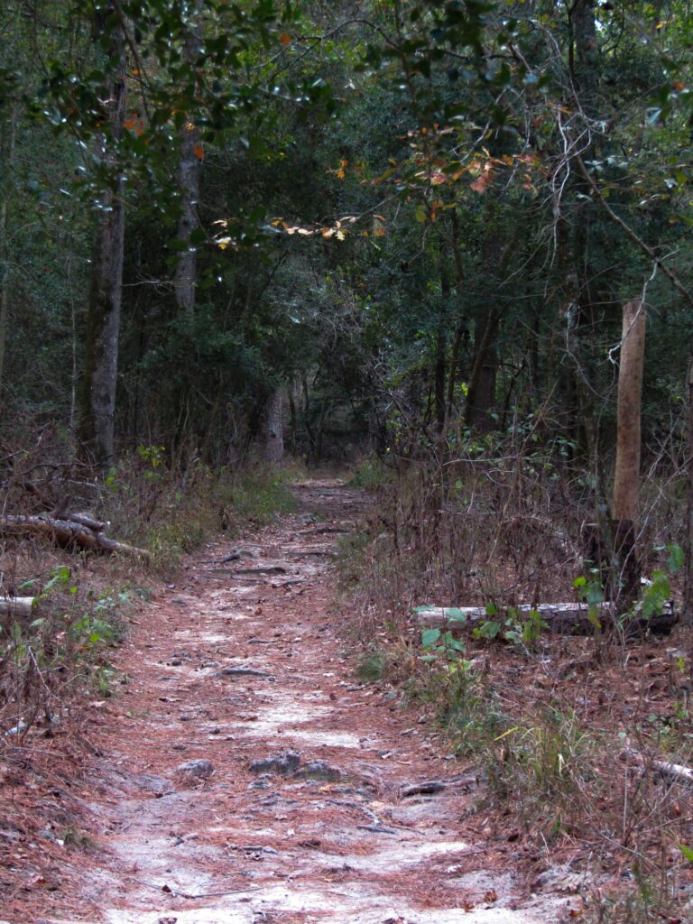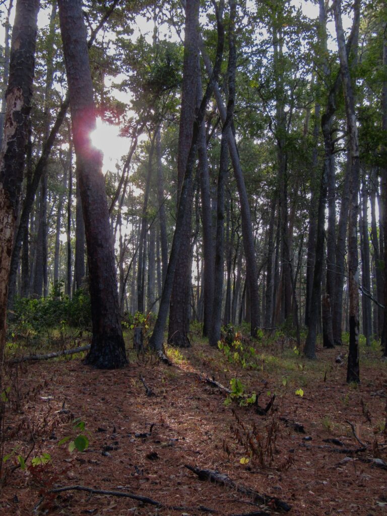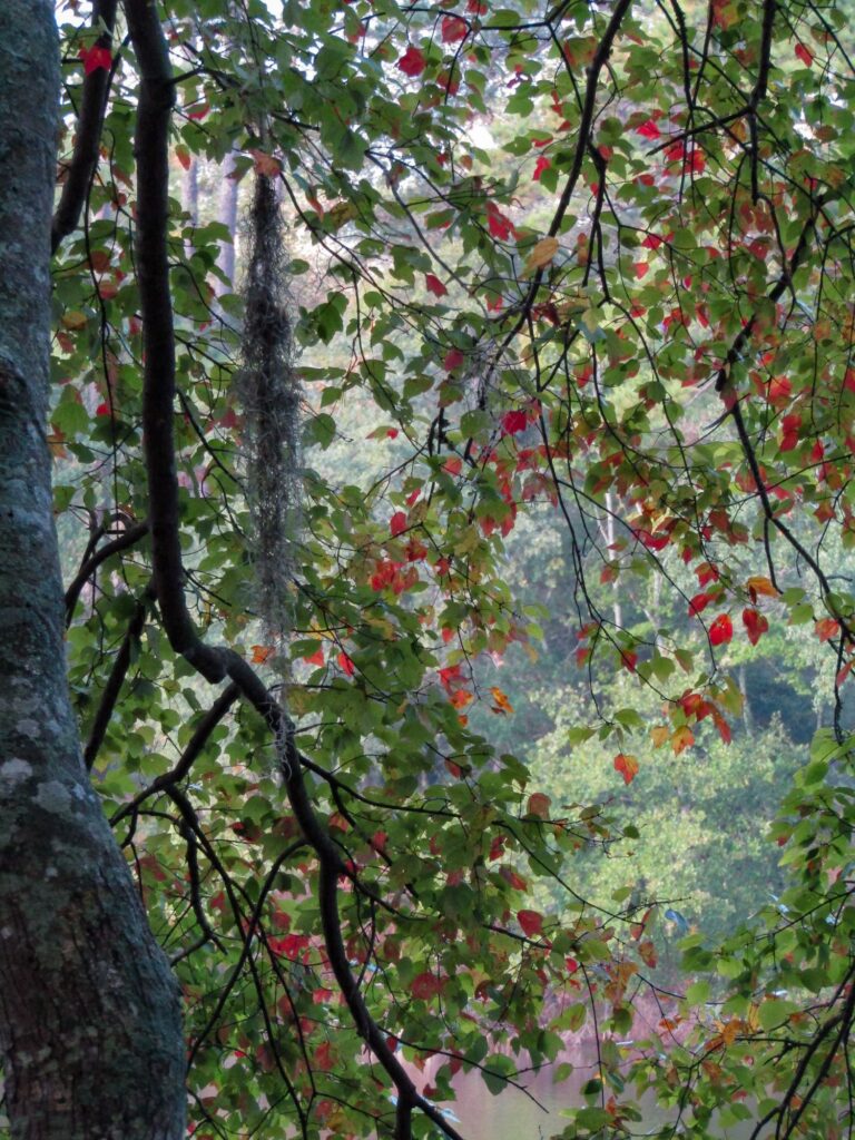 Along the path, the occasional glimmer offered, as the sun broke through from time to time, cast the pine needle and leaf floor of the woods with warming streaks of light.
